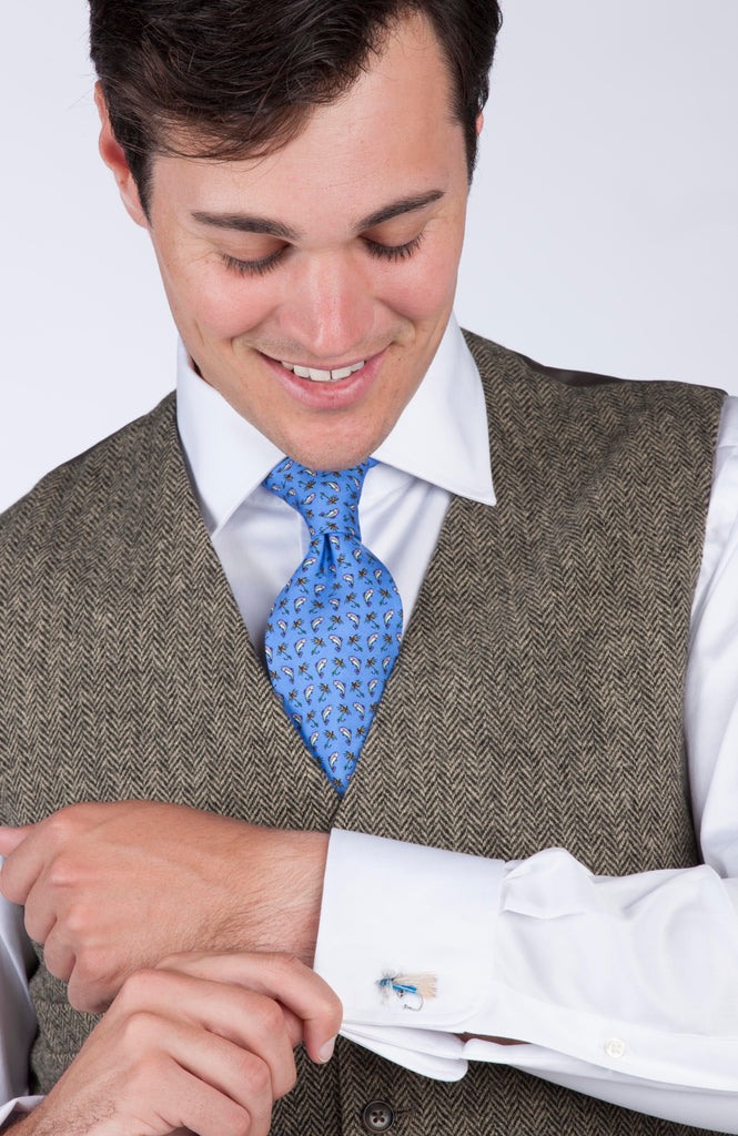This time's the charm! This true-blue fly originally hails from Scotland, but is known as a winner here in the States. Ideal for early morning casts due to its coloring, this is a salmon's perfect breakfast. With the Blue Charm you likely feel too big for your britches - er - waders!Each set features authentic, durable materials ensuring a longer shelf life than most of what's in your tackle box. Each fly is specifically designed to go in either the left or right French cuff sleeve for the sharpest possible look. Speaking of sharp, don't worry, these beauties don't have real hooks, and their hardware ensures they'll hold steady all night long.